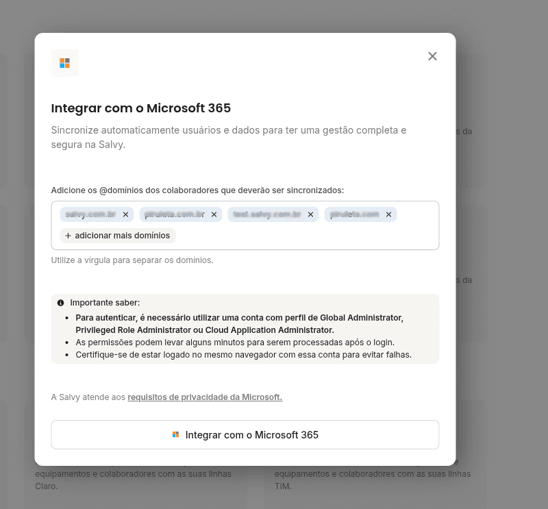 Na prática, isso significa que, se a empresa tem usuários como terceiro@outraempresa.com.br e pessoa@salvy.com.br no Microsoft, é possível selecionar apenas o domínio salvy.com.br.